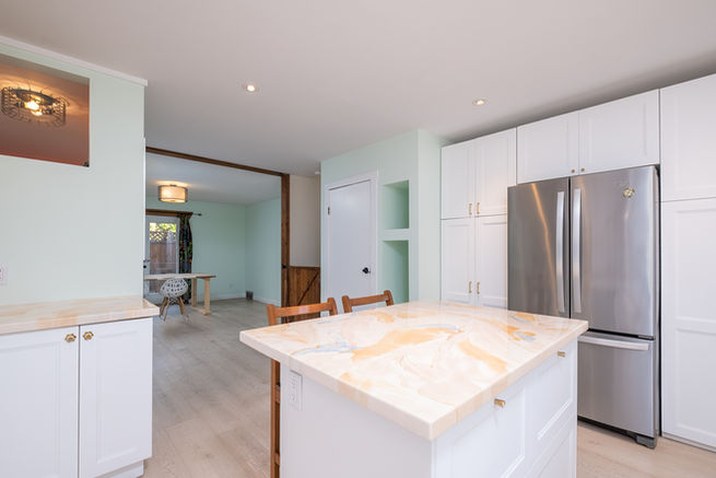 and tastefully designed kitchen featuring newer flooring, modern appliances, abundant counter &cupboard space, and a central island.